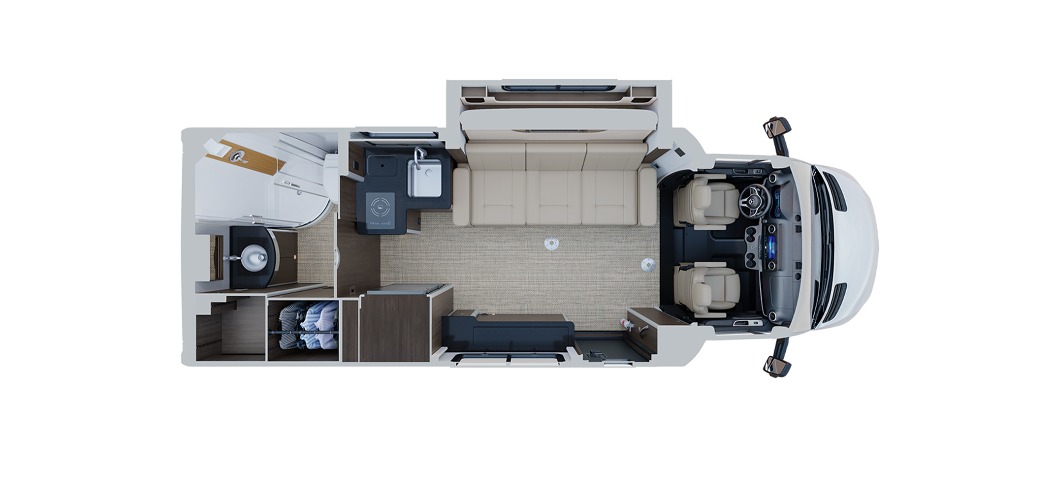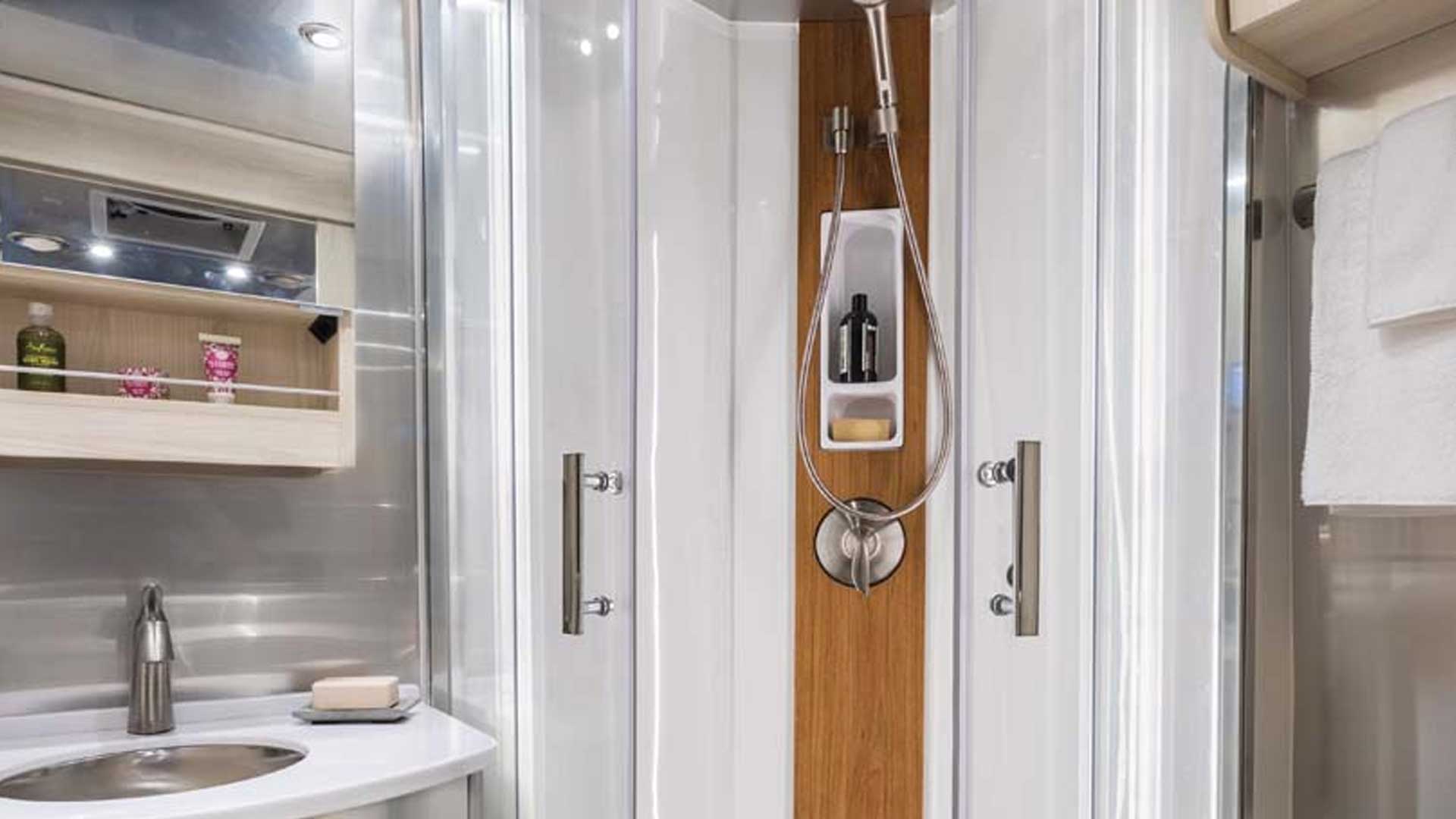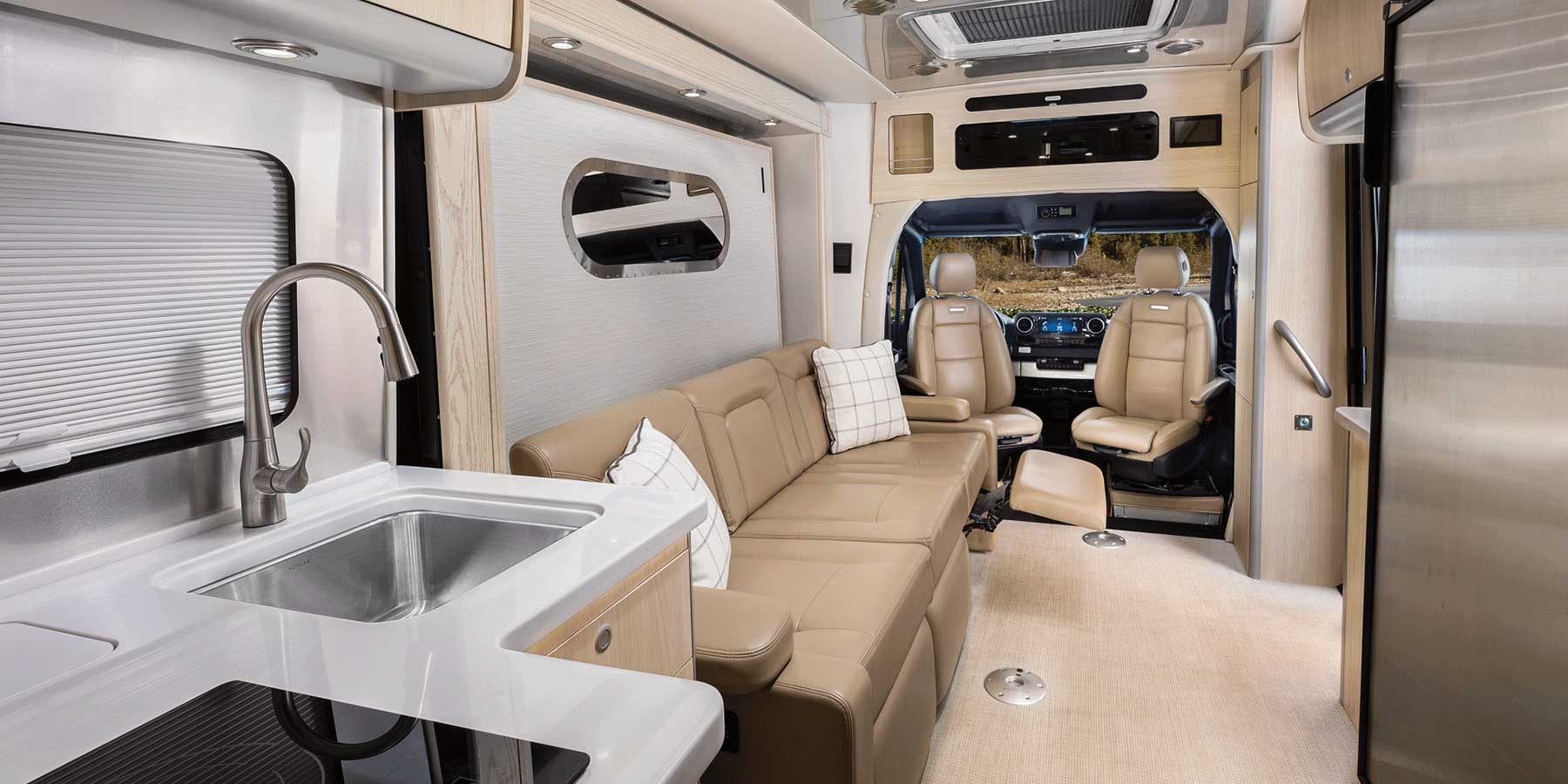 Comfort and convenience continue throughout the coach with thoughtful tech and functional touches designed for modern travel. The advanced power system with lithium batteries helps support off-grid living, while premium air ride suspension and Mercedes-Benz safety systems enhance your time on the road. Additional amenities include a high-end galley kitchen, powered awning, automatic entry step, dedicated camera monitor, and climate control that keeps the interior quiet and comfortable. With upscale interior decor options and features that make life on the road effortless, the Atlas 25MS sets a new standard for luxury touring coaches.