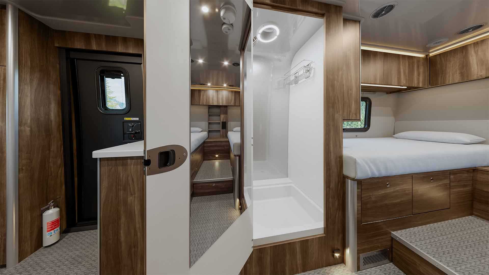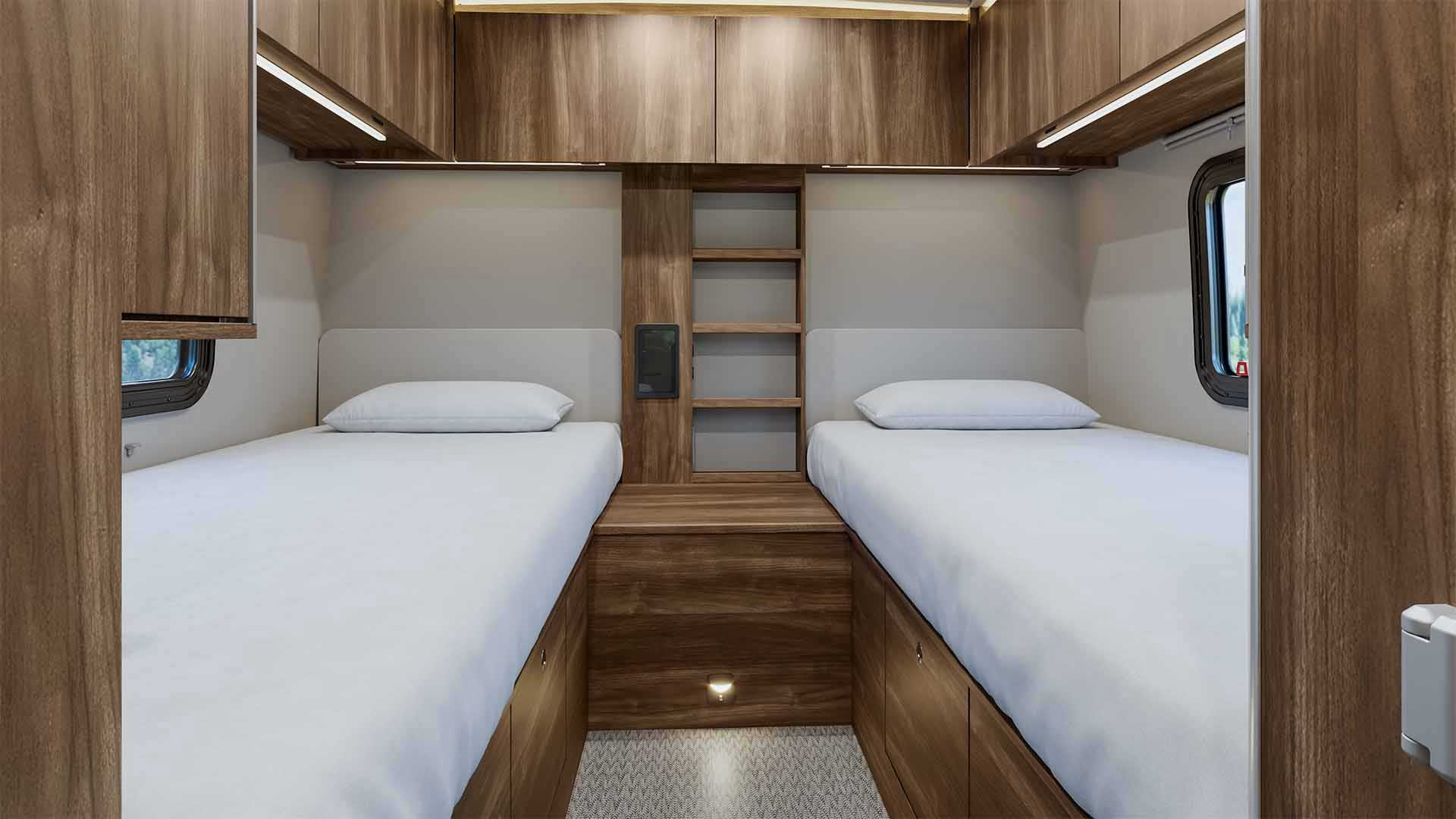 Inside, the 2026 Atlas 25RT is thoughtfully crafted for comfort and convenience on every journey. Twin beds and a split dry bath create a spacious, functional interior while generous storage throughout keeps gear and essentials organized. Premium features include an intuitive Garmin multiplex system for lighting and climate control, a stowable induction cooktop, and a JBL sound system for entertainment that feels at home on the road. A dedicated rear pass-through garage adds flexibility for gear and outdoor essentials, and modern touches like ducted climate control and a Smart HDTV complete a coach that’s ready for weekend getaways or extended adventures.