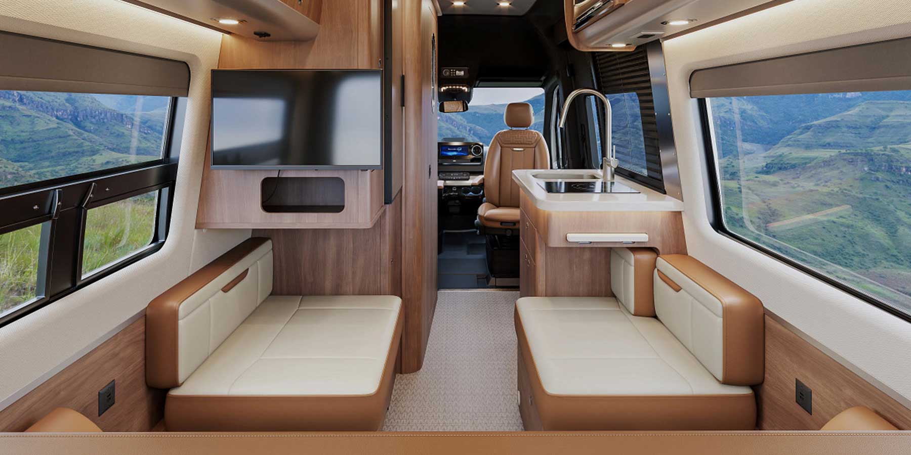 Inside, the 19GT maximizes every inch of space with a power-reclining rear sofa that converts into a comfortable bed, a modern galley kitchen with solid-surface countertops and stainless steel appliances, and a full wet bath. Advanced safety systems, touchscreen controls, lithium battery power, and available solar keep it tech-forward and travel ready. With Airstream craftsmanship and Mercedes-Benz performance, the Interstate 19GT offers a refined, go-anywhere touring experience in a compact footprint.