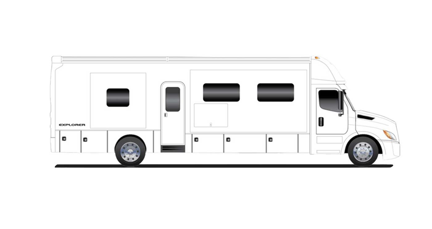 Inside, the Explorer feels every bit like a high-end residence on wheels, featuring heated porcelain tile flooring, hardwood cabinetry, solid-surface countertops, and Ultraleather seating throughout. Spacious floorplans offer multiple slide-outs, theater seating, electric fireplaces, king beds, and residential-style bathrooms, all supported by advanced technology like digital multiplex controls, solar power, Aqua-Hot hydronic heating, and premium appliances. Finished with striking full-body paint, frameless windows, LED lighting, and superior insulation, the Explorer delivers luxury travel without limits.